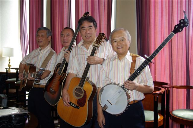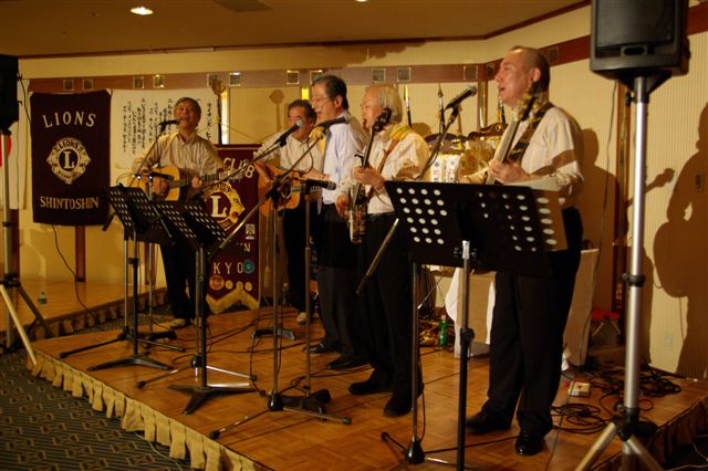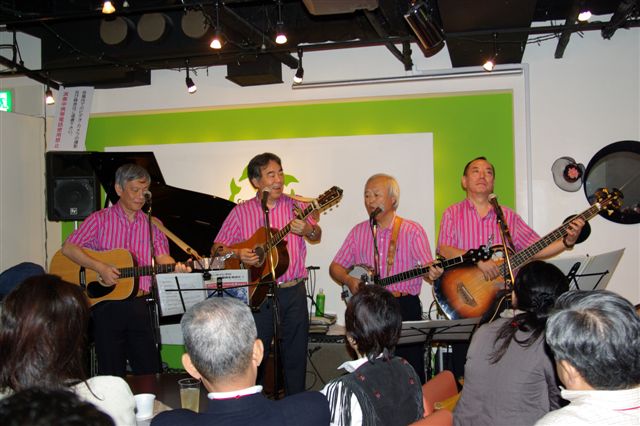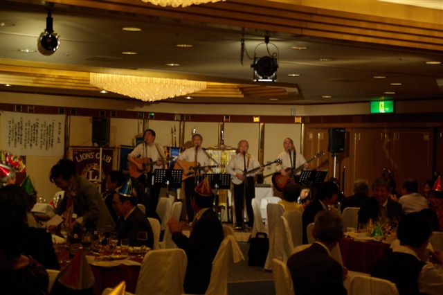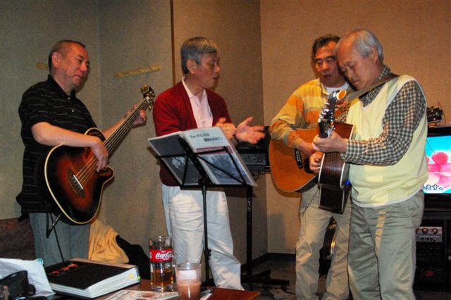 当日、バンジョーの谷戸も上京し12時半にいつもの新宿カラオケ館に集結・練習、4時過にヒルトンホテルに移動し会場準備。