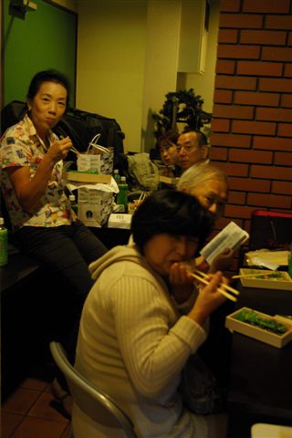 メンバーとTUTスタッフ(チームTUT)にとって、ホテルからグリーンドルフィンまでが大変な移動となります。メイン会場から少し離れているのと、演奏終了後、次の奏者に楽屋を明け渡すために早々に出るため、昼食の弁当を食べる時間が無く、移動後のグリーンドルフィンの控え室が昼食の場になるのです。